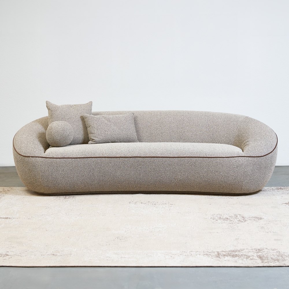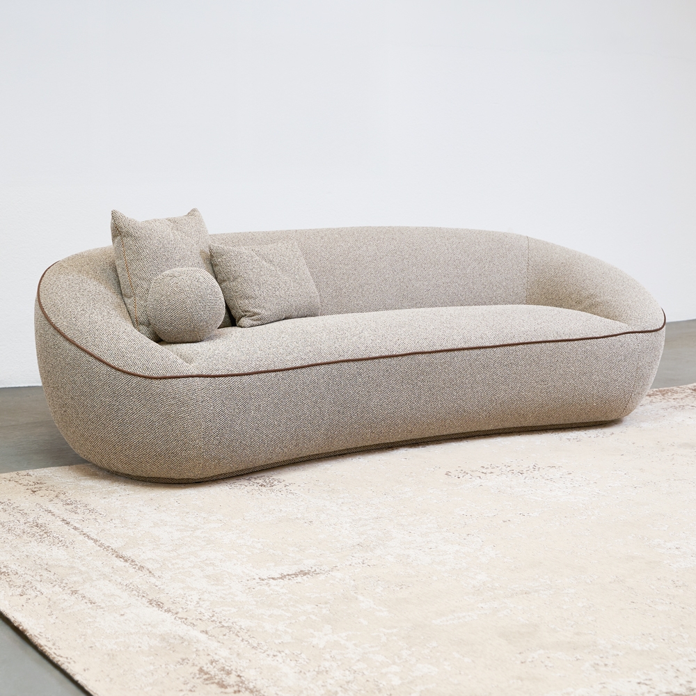 Sofá de diseño orgánico con líneas envolventes que brindan máxima comodidad. Tapizado en tono neutro con textura sutil y detalle de vivo que realza su silueta. Una pieza contemporánea que aporta suavidad y sofisticación a tu sala.
