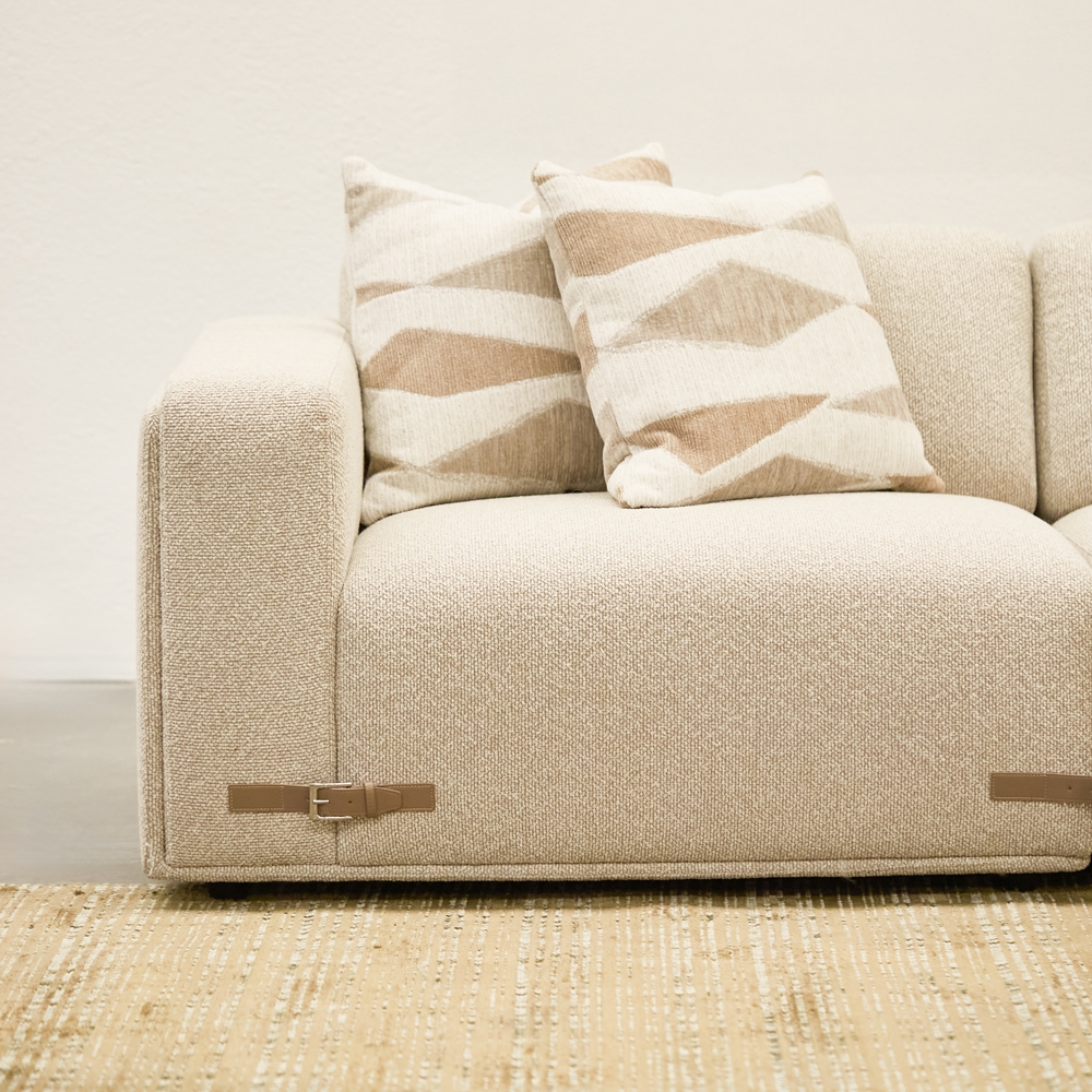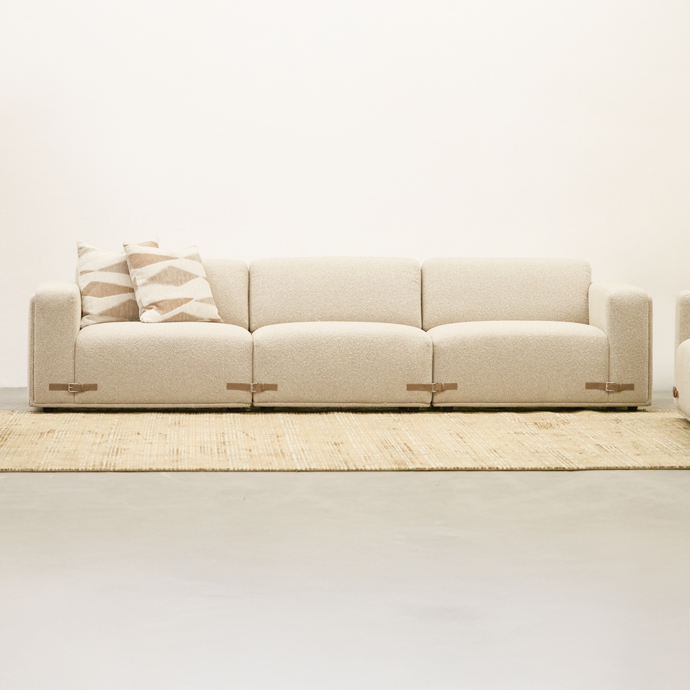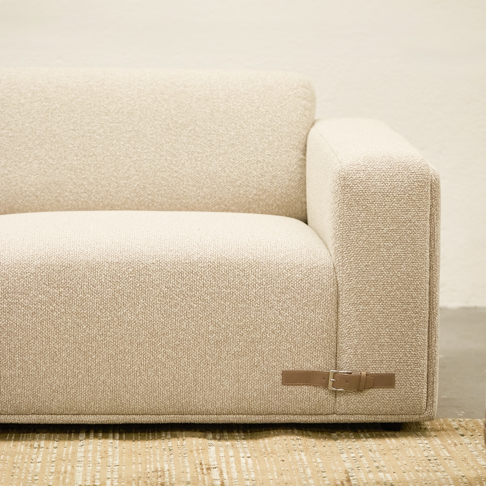 Sofá de líneas limpias y volumen generoso, tapizado en una textura suave y cálida. Su tono neutro ilumina el espacio y se adapta a cualquier estilo. Ideal para crear ambientes serenos, cómodos y atemporales.