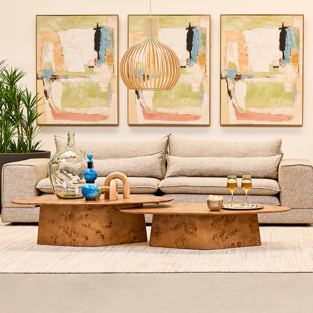 Mesa de centro de diseño orgánico, elaborada en madera con un acabado cálido y natural. Su forma ovalada y base sólida aportan carácter y equilibrio visual. Una pieza protagonista que suma elegancia y sofisticación a cualquier espacio.