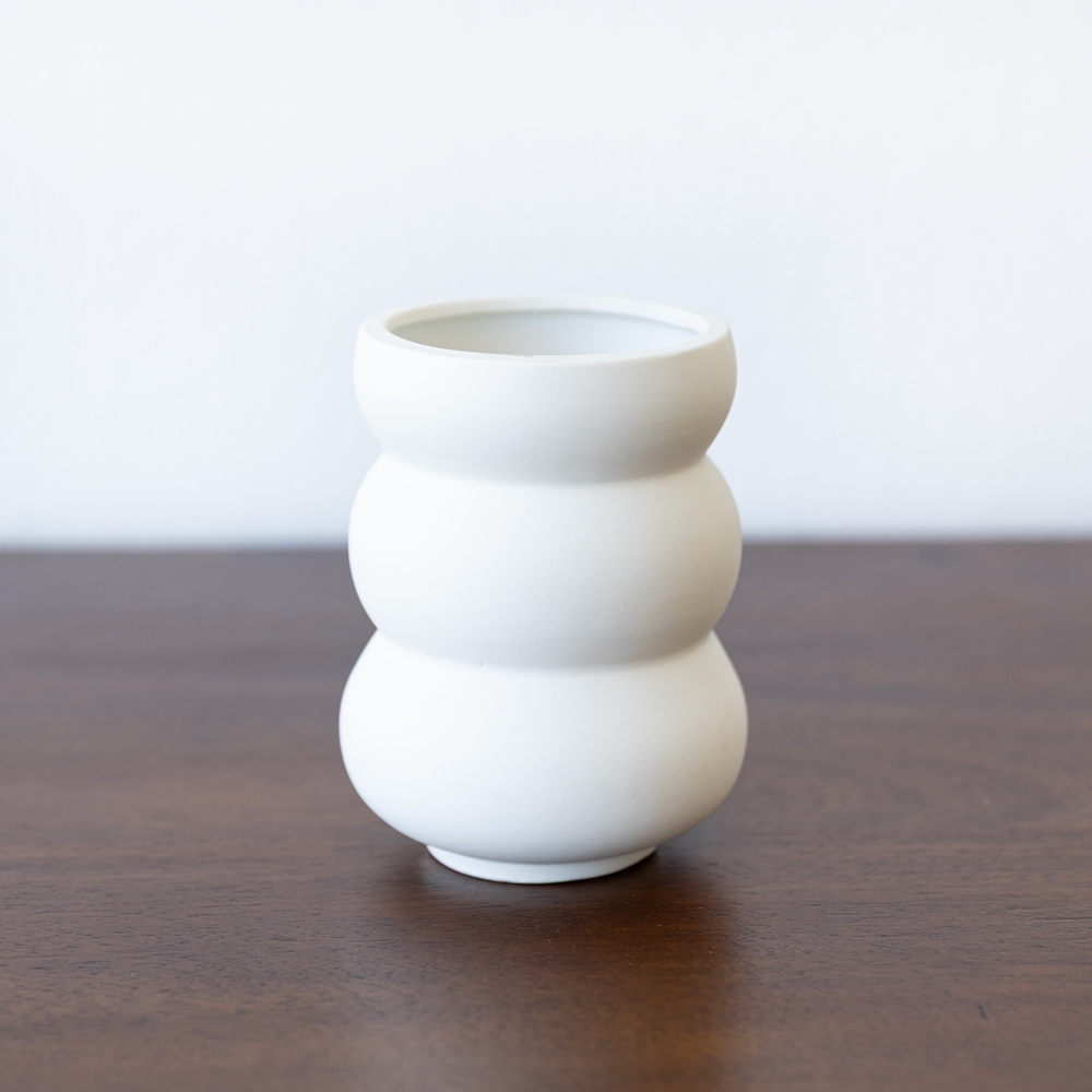 Mini florero de cerámica con diseño de curvas suaves y acabado mate en tono neutro.