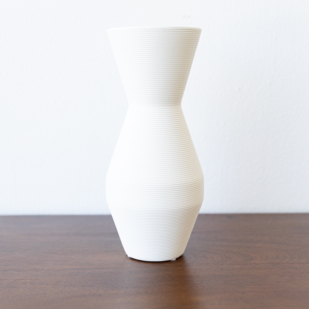 Florero de silueta estilizada con base amplia y cuello alargado que aporta elegancia visual. Su acabado en tono blanco con textura acanalada realza su diseño moderno y minimalista. Ideal para lucirlo en mesas, consolas o como pieza protagonista en cualquier espacio.