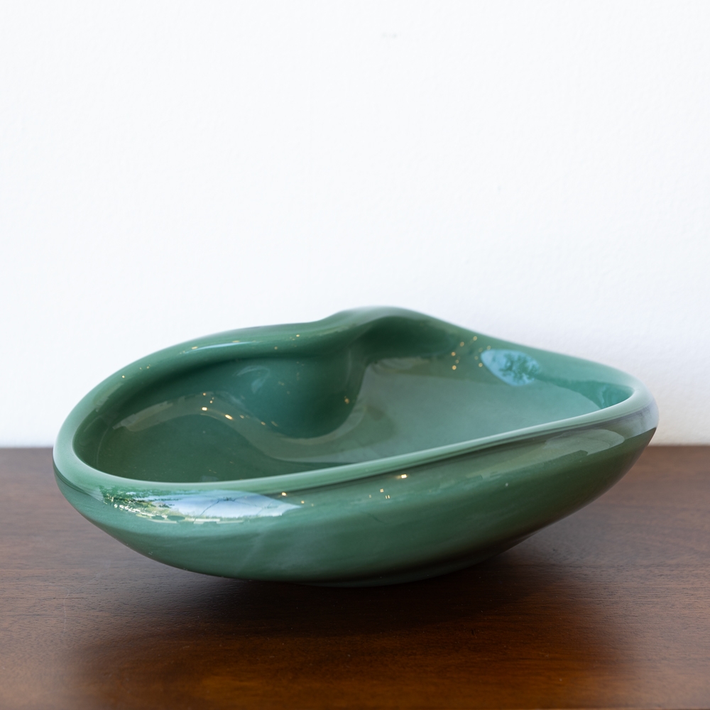 Pieza decorativa de vidrio en tono verde con acabado brillante y forma orgánica. Su diseño fluido y contemporáneo aporta un toque artístico al espacio. Ideal para destacar en mesas, consolas o repisas con estilo sofisticado.