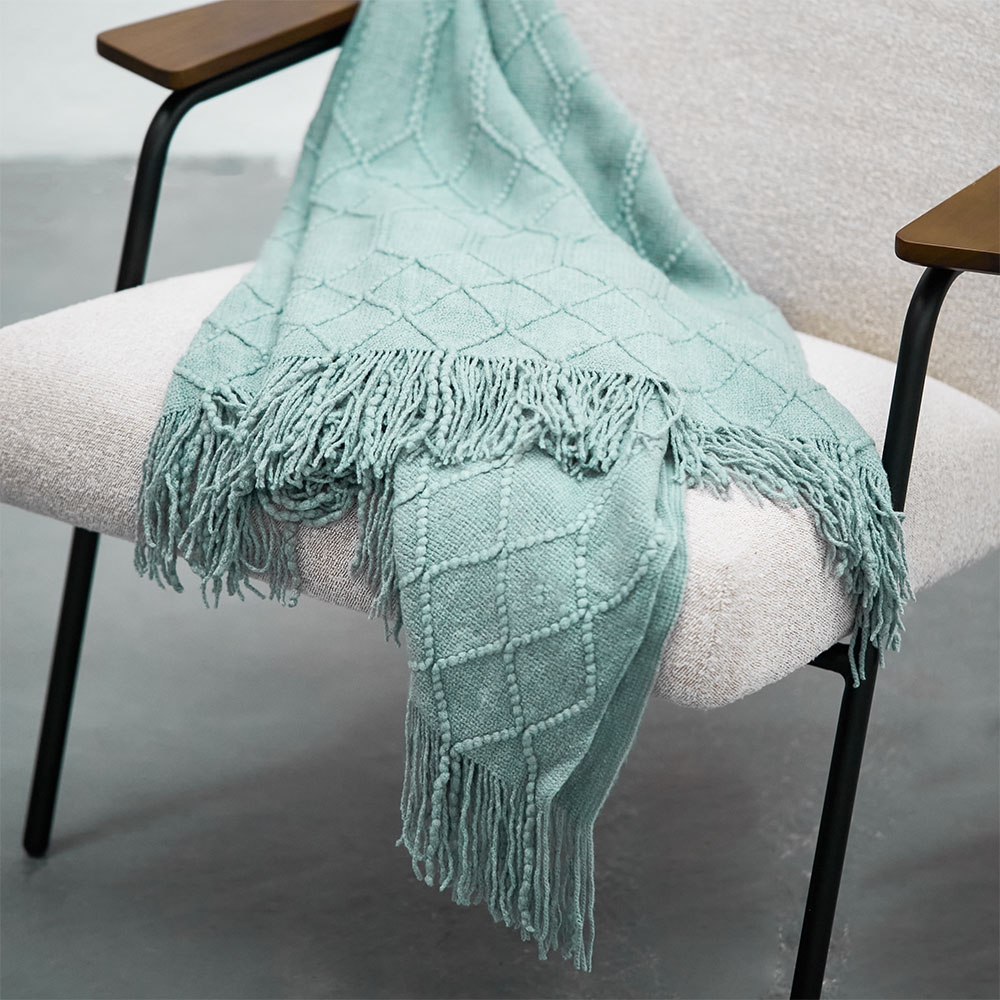 Throw decorativo en tono menta con textura geométrica tejida que aporta calidez y estilo. Acabado con delicados flecos que añaden un toque acogedor y elegante a cualquier espacio. Perfecto para complementar sofás, sillones o camas con un aire fresco y contemporáneo.