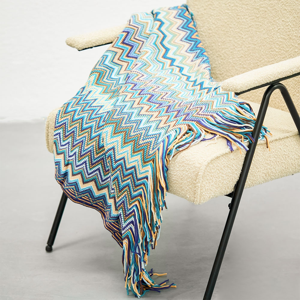 Throw de tejido ligero con vibrante patrón zigzag en tonos azules, mostaza y crema. Acabado con flecos que aportan movimiento y un toque artesanal. Perfecto para dar color y estilo a cualquier espacio.