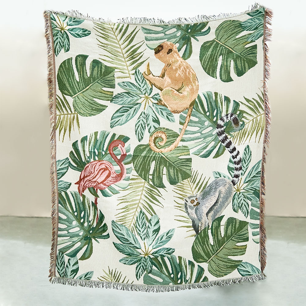 Throw decorativa con estampado tropical de hojas y animales que aporta frescura y estilo. Tejido suave con acabado en flecos para un look artesanal. Ideal para dar un toque natural y vibrante a cualquier espacio.