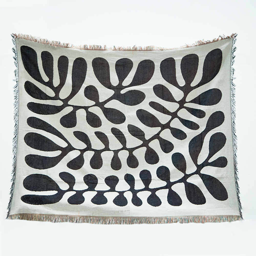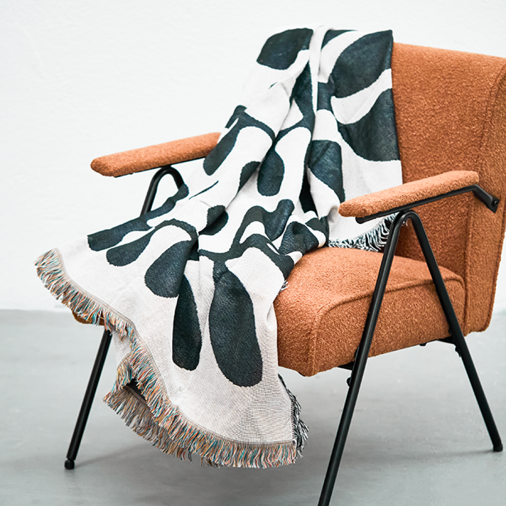 Throw decorativo con diseño orgánico en contraste blanco y negro de estilo moderno. Tejido suave con acabado de flecos que aporta textura y elegancia. Perfecto para sofás o camas, añadiendo un toque gráfico y contemporáneo.