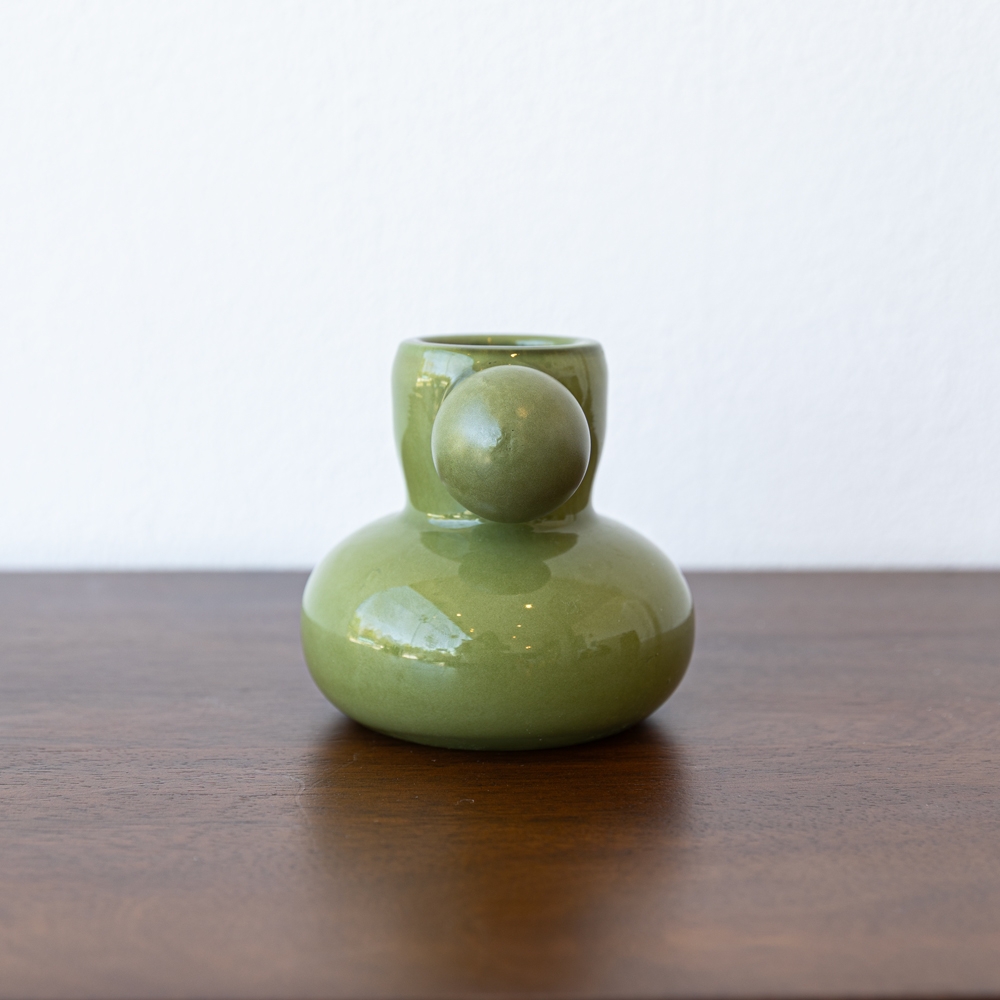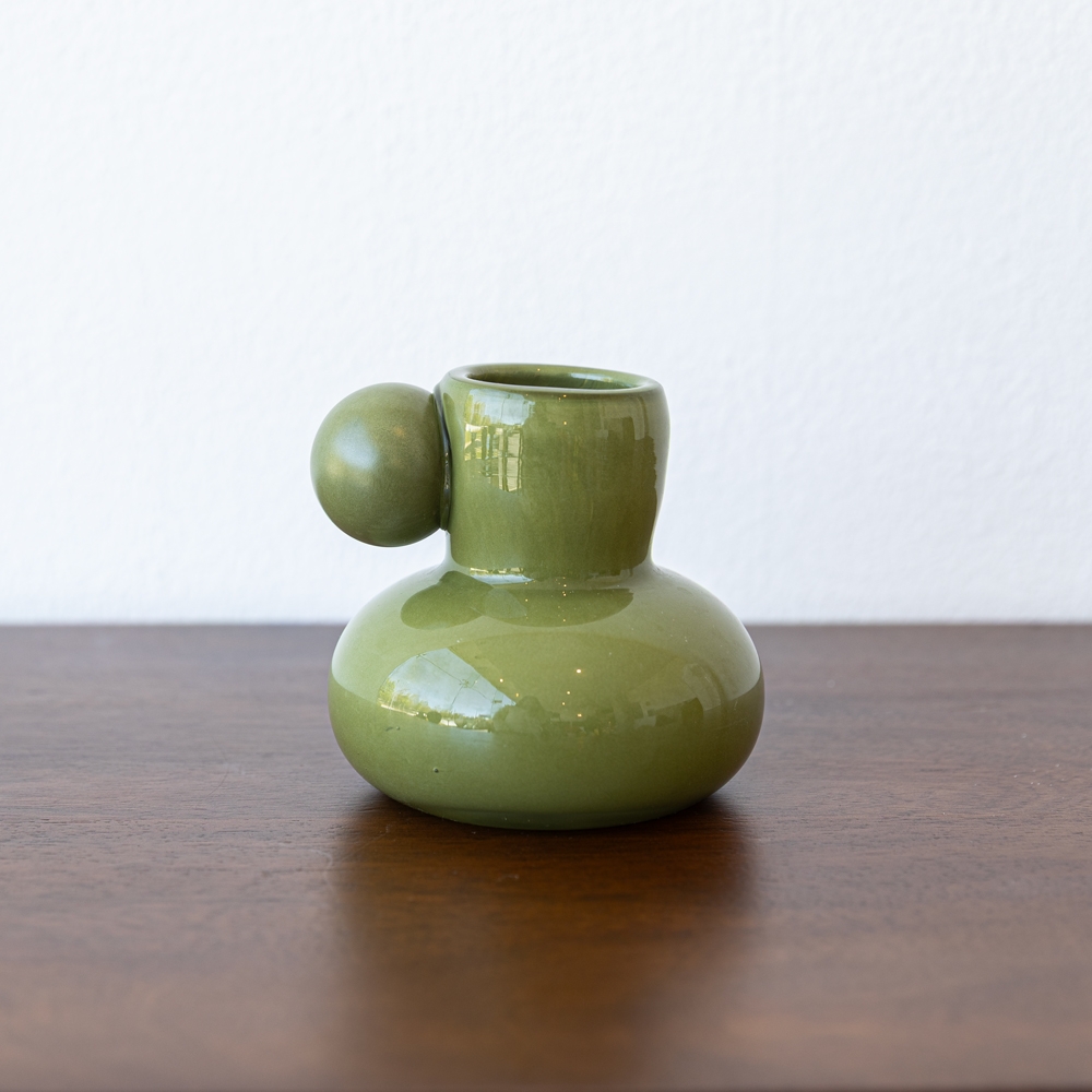 Florero de vidrio en tono verde claro con acabado brillante y sofisticado. Su diseño de doble volumen y detalle esférico lateral le aporta un estilo contemporáneo y artístico. Perfecto para destacar en mesas, repisas o como acento decorativo lleno de personalidad.