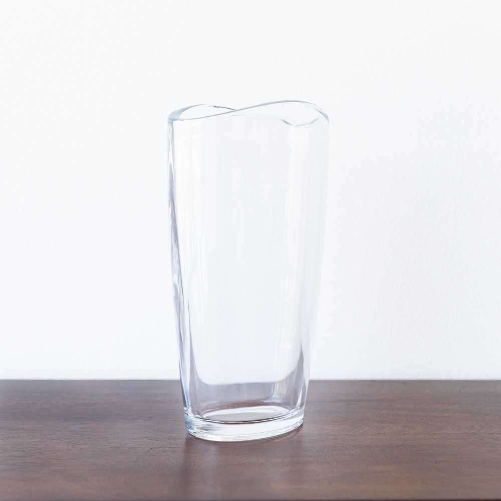 Florero de vidrio transparente con diseño alto y líneas limpias que resaltan su elegancia. Su borde suavemente ondulado aporta un detalle sutil y contemporáneo. Perfecto para arreglos florales estilizados o para complementar una decoración minimalista.