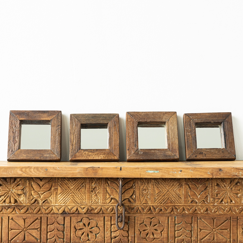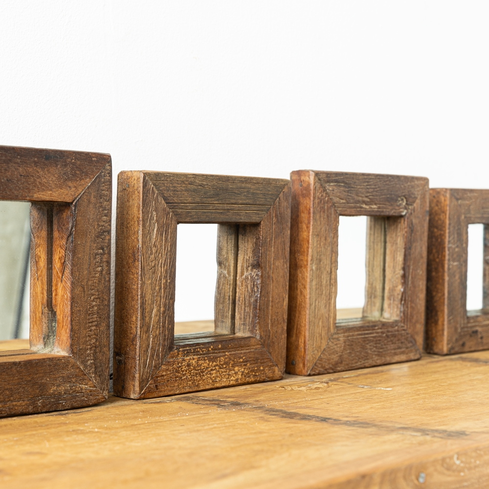 Espejo decorativo de pequeño formato con marcos de madera en acabado natural envejecido. Cada pieza destaca por sus vetas y texturas únicas que aportan un estilo auténtico. Ideales para crear composiciones cálidas y elegantes en cualquier espacio.