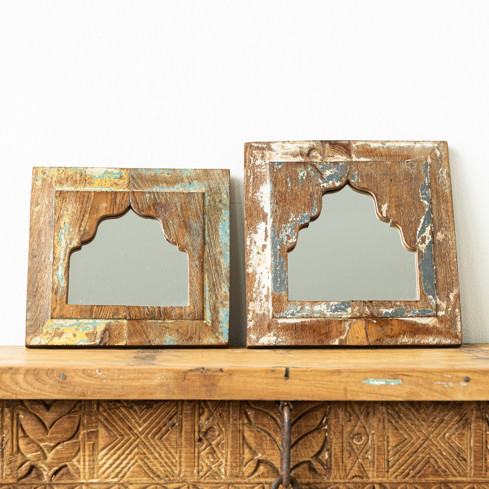 Espejo decorativo con marco de madera reciclada y acabado envejecido lleno de carácter. Su diseño con arco aporta un toque artesanal y exótico a cualquier espacio. Ideales para añadir calidez y personalidad en ambientes rústicos o bohemios.