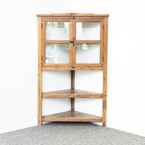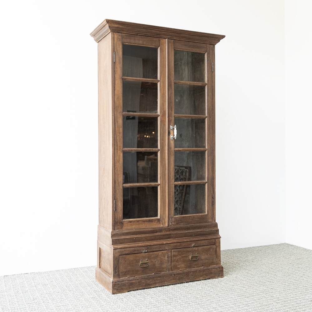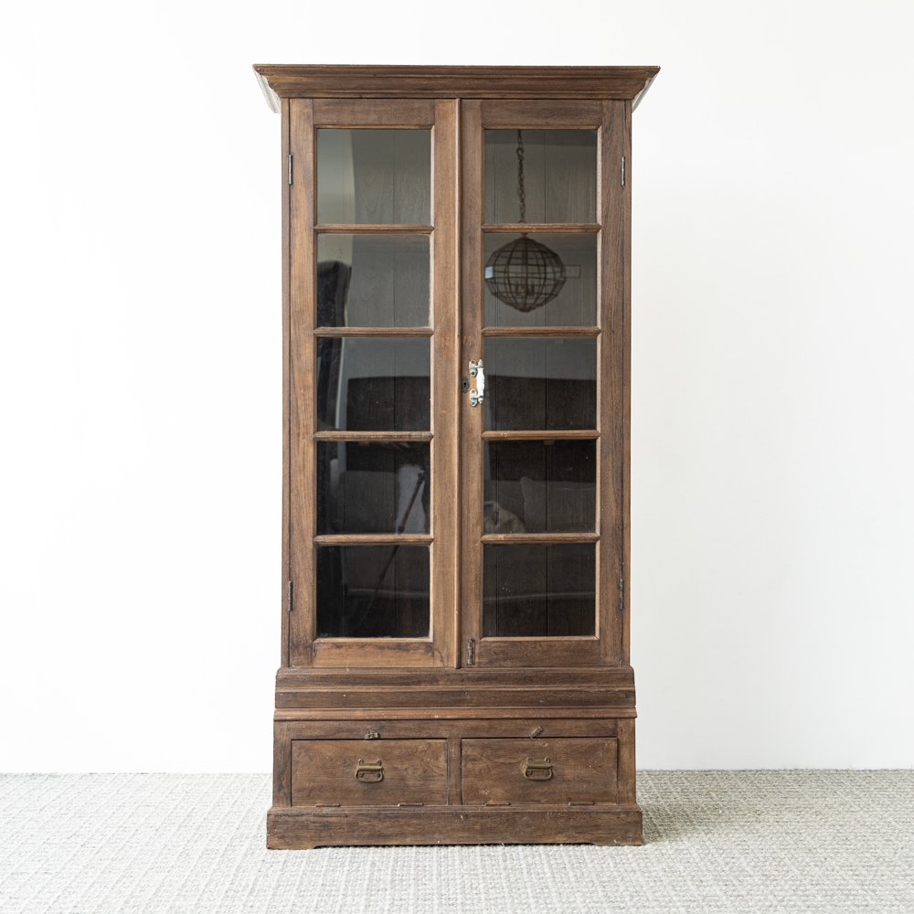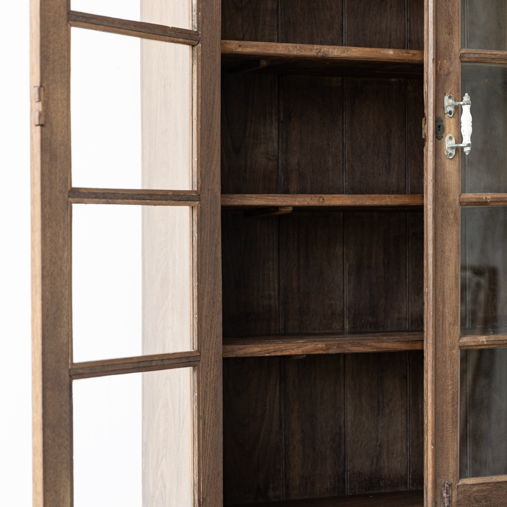 Librera alta de madera con acabado natural y elegante estilo rústico. Sus puertas acristaladas y estantes interiores permiten exhibir vajilla u objetos decorativos. Incluye cajones inferiores que aportan espacio extra de almacenamiento y funcionalidad.