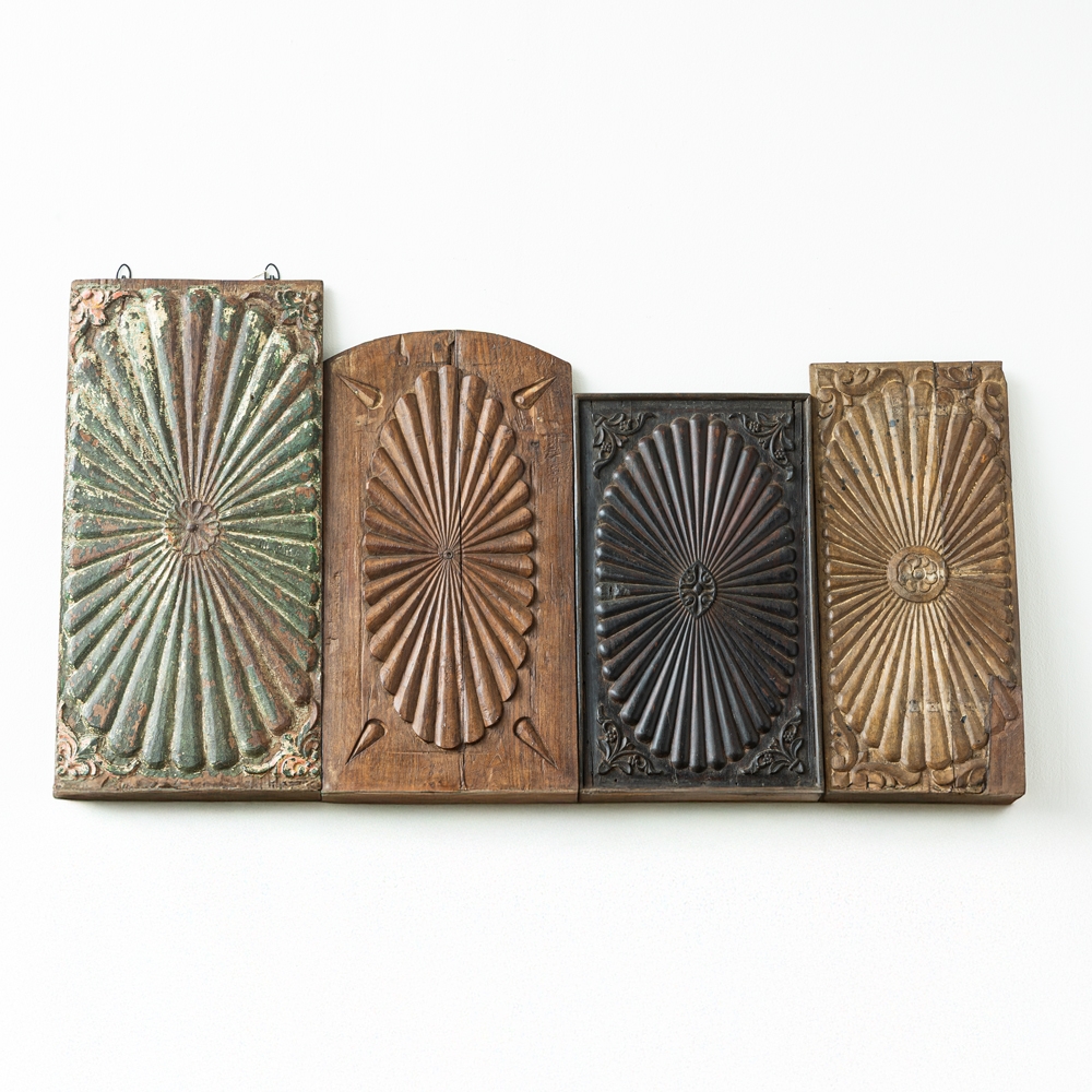 Panel decorativo de madera tallada con diseños radiales que evocan un estilo artesanal y único. Cada pieza presenta acabados y tonos distintos, aportando carácter y personalidad. Ideales para combinar y crear composiciones a medida.