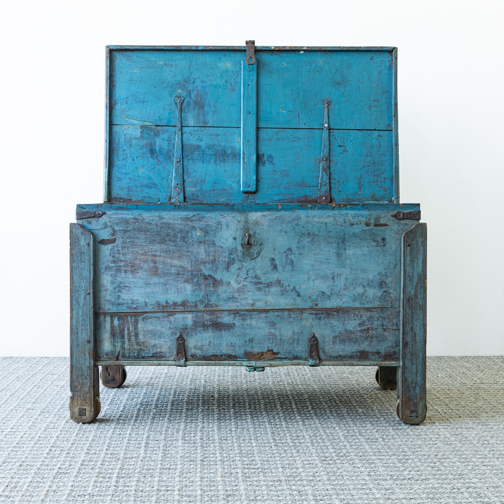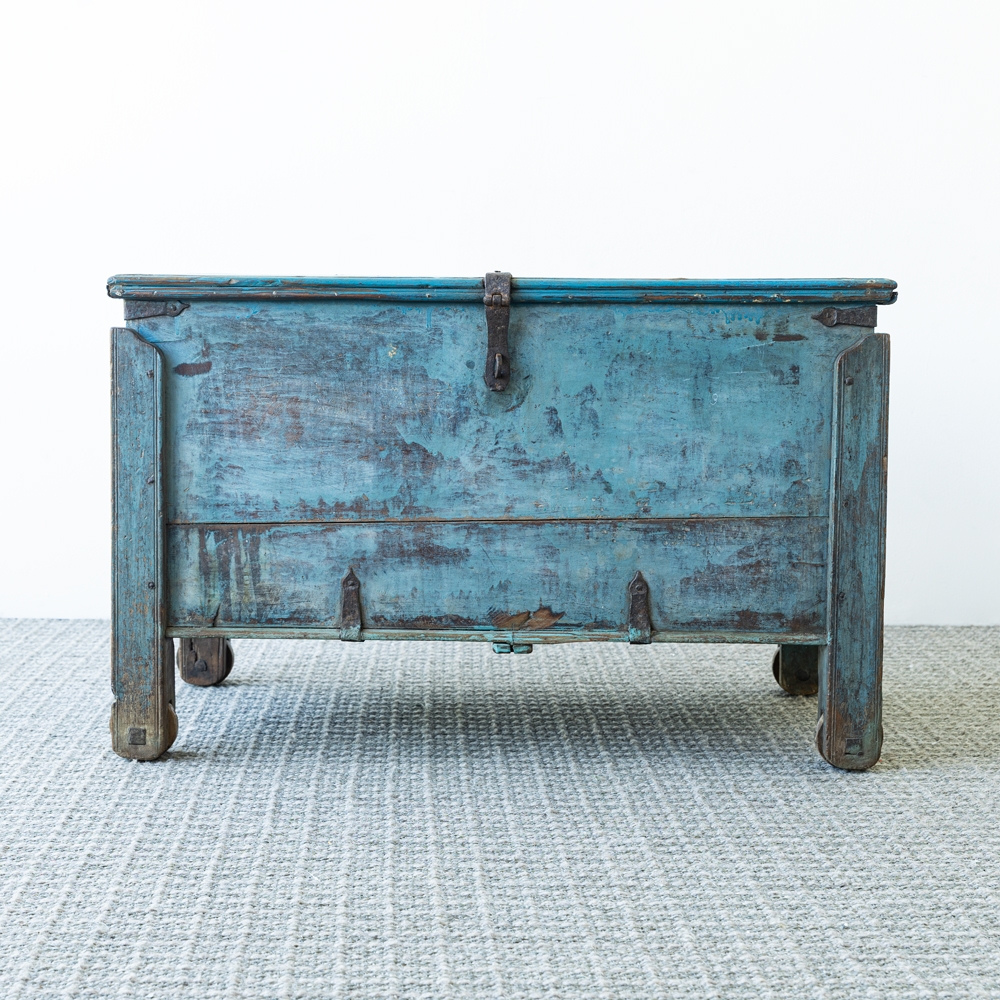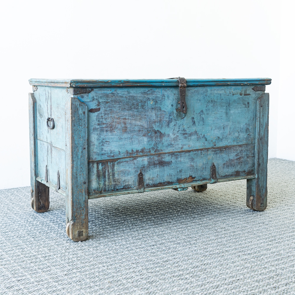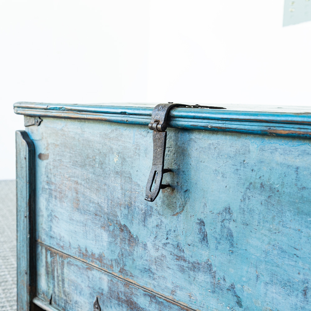 Baúl de madera vintage con acabado envejecido en tono azul, lleno de carácter y autenticidad. Detalles metálicos y herrajes originales que resaltan su estilo rústico y artesanal. Perfecto como pieza decorativa y funcional para almacenamiento en cualquier espacio.