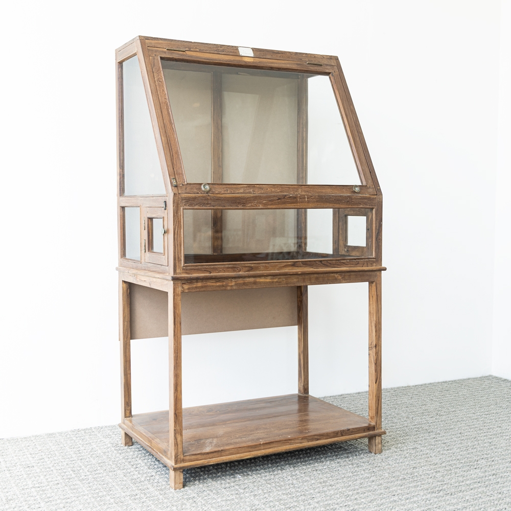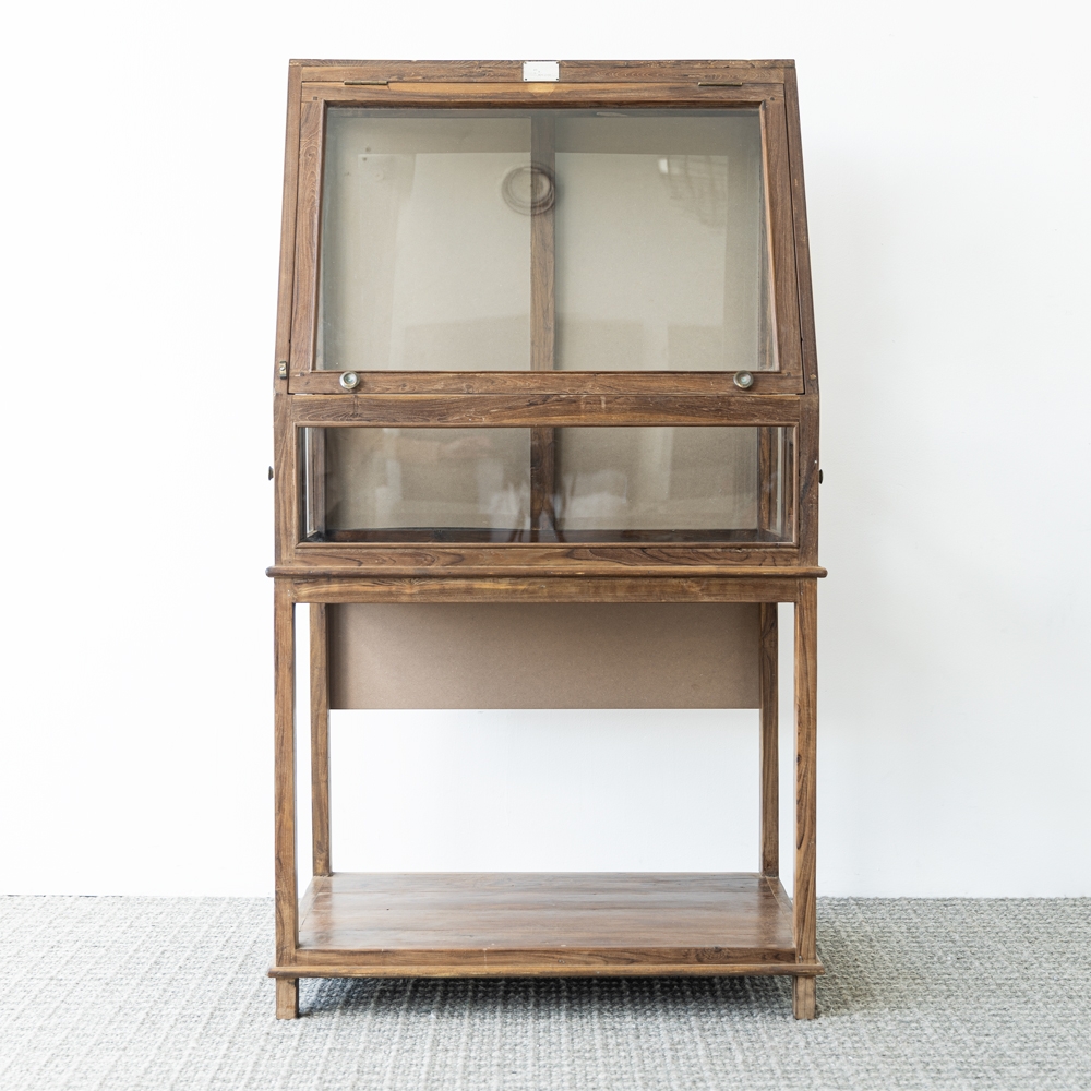 Vitrina expositora de madera con diseño clásico y estructura elevada. Sus paneles acristalados permiten mostrar objetos con claridad mientras los protegen. Ideal como mueble decorativo o expositor en salones, tiendas o espacios con estilo vintage.
