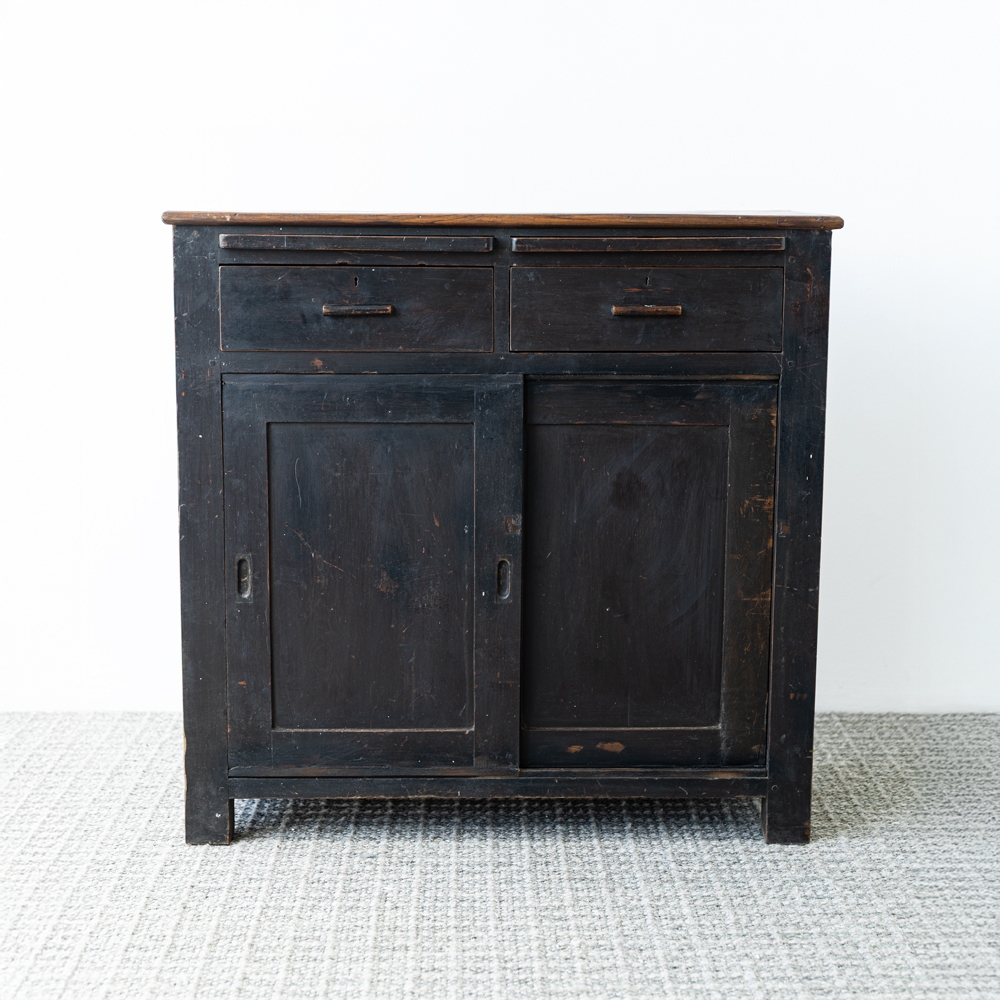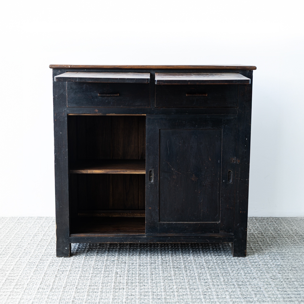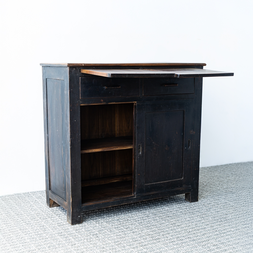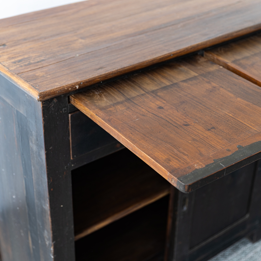 Mueble de madera de estilo rústico con acabado oscuro y encimera extensible. Cuenta con cajones superiores, puertas correderas y estantes interiores para almacenamiento práctico. Ideal como aparador o mueble auxiliar que combina funcionalidad y carácter vintage.
