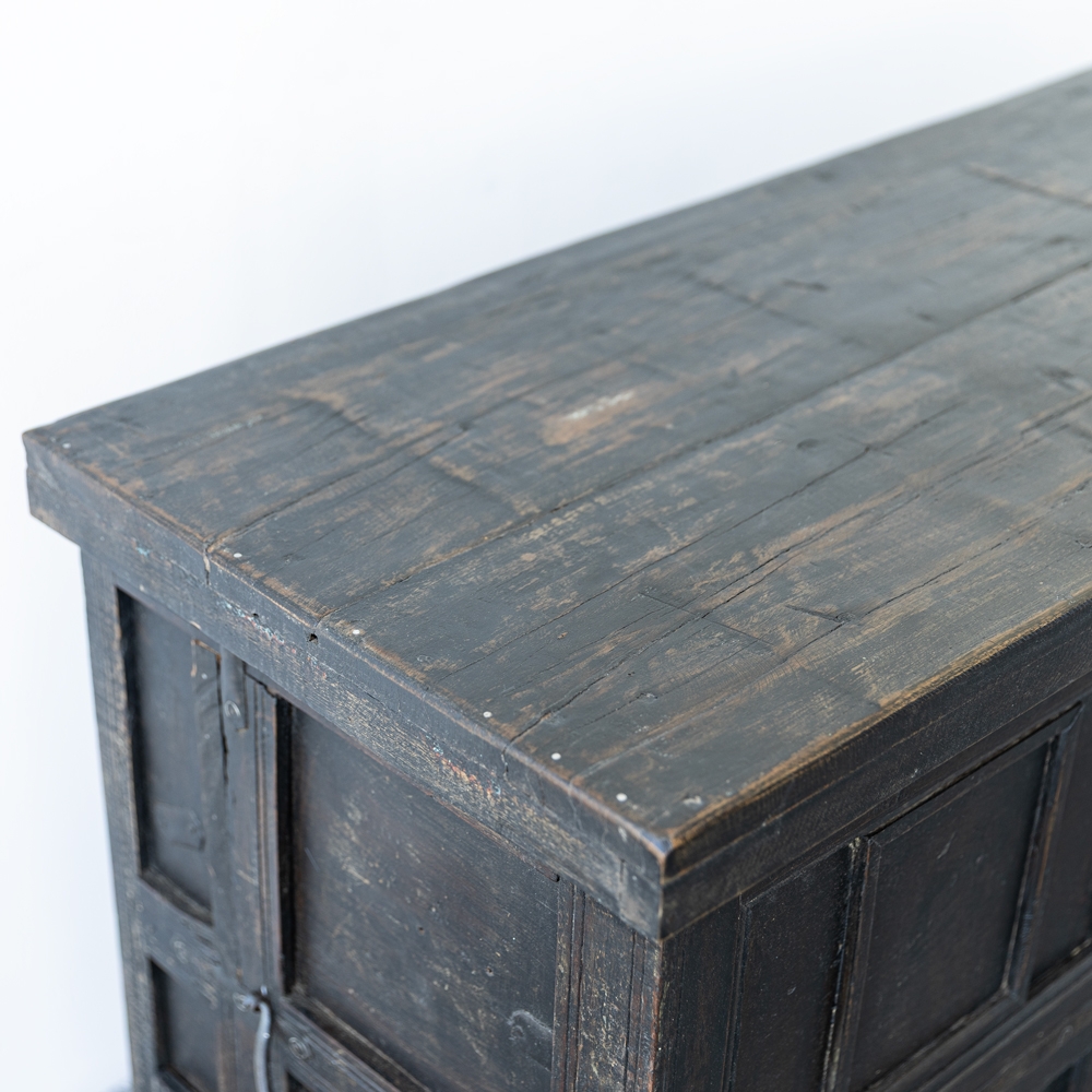 Consola de madera maciza con acabado oscuro y estilo rústico tradicional. Diseño robusto con paneles decorativos, patas torneadas y detalles metálicos que realzan su carácter. Perfecta como mueble de almacenamiento o pieza protagonista en salones y comedores.