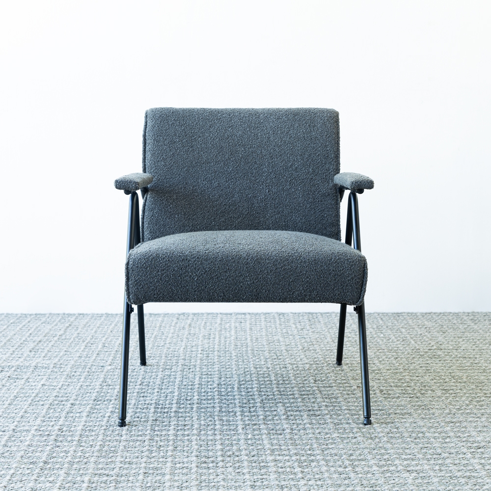 Butaca moderna de diseño minimalista, tapizado en tela gris suave y resistente. Estructura ligera de metal negro con reposabrazos integrados para mayor comodidad. Ideal para espacios contemporáneos, combina estilo, confort y funcionalidad.