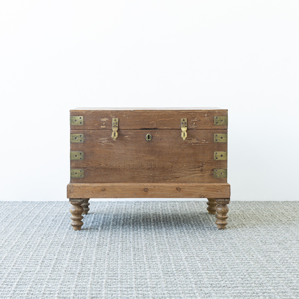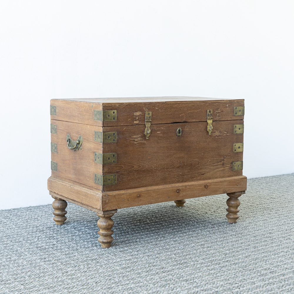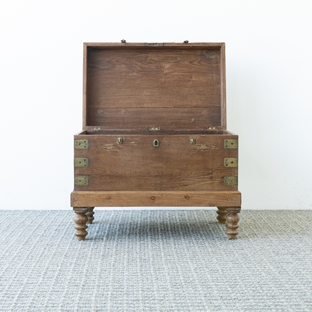 Baúl de madera con acabado rústico y elegantes detalles en herrajes metálicos. Elevado sobre patas torneadas que aportan ligereza y estilo clásico. Ideal como pieza decorativa y funcional para almacenamiento con carácter.