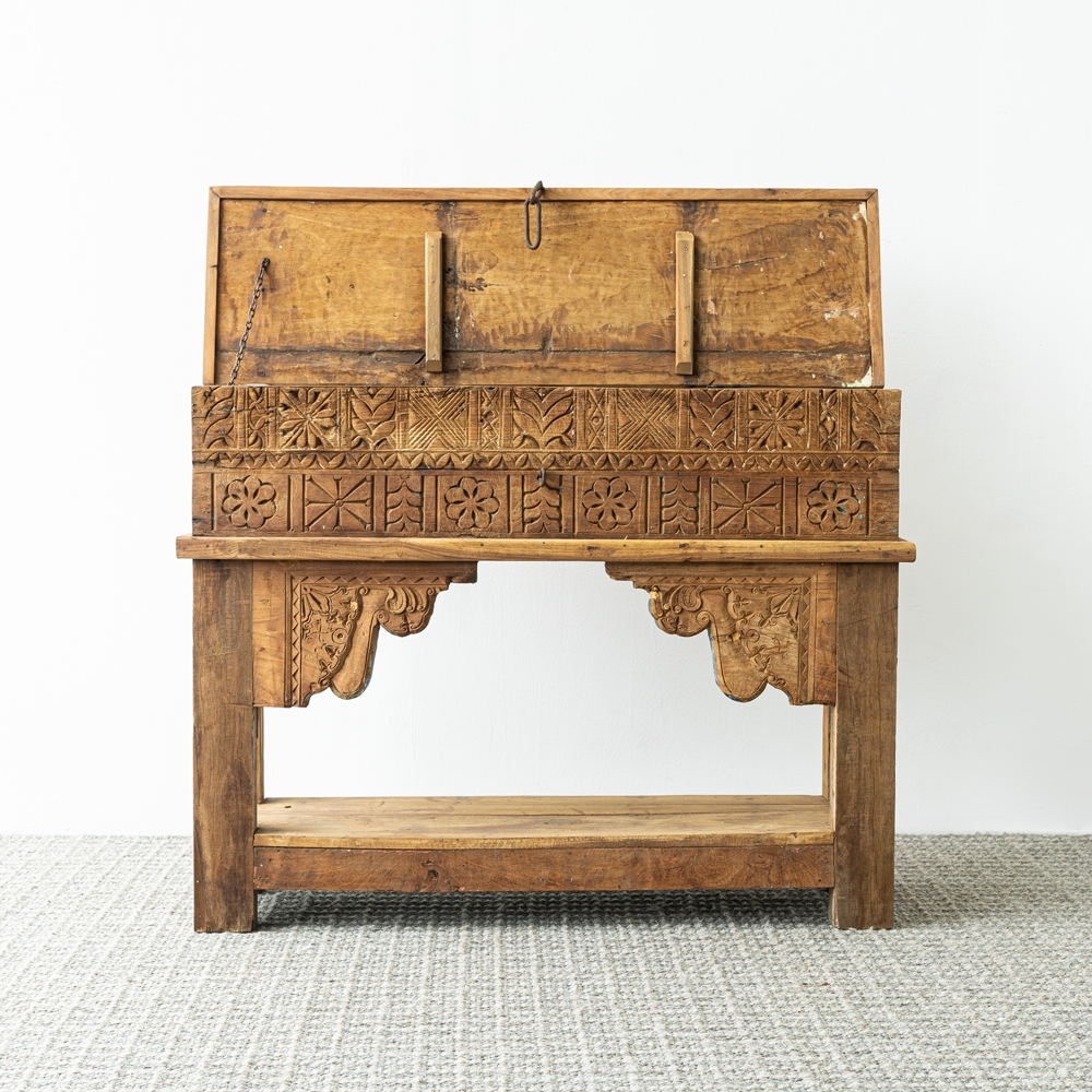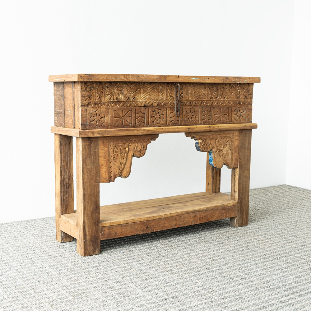 Consola de madera tallada a mano con detalles ornamentales que reflejan un estilo artesanal único. Su diseño robusto y decorativo aporta carácter y calidez a cualquier espacio. Ideal como pieza protagonista en recibidores o ambientes con inspiración étnica.